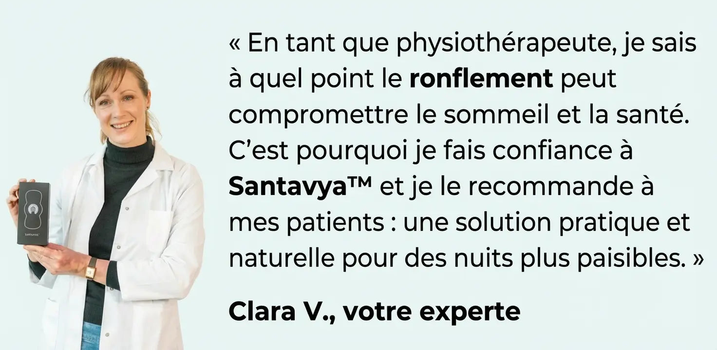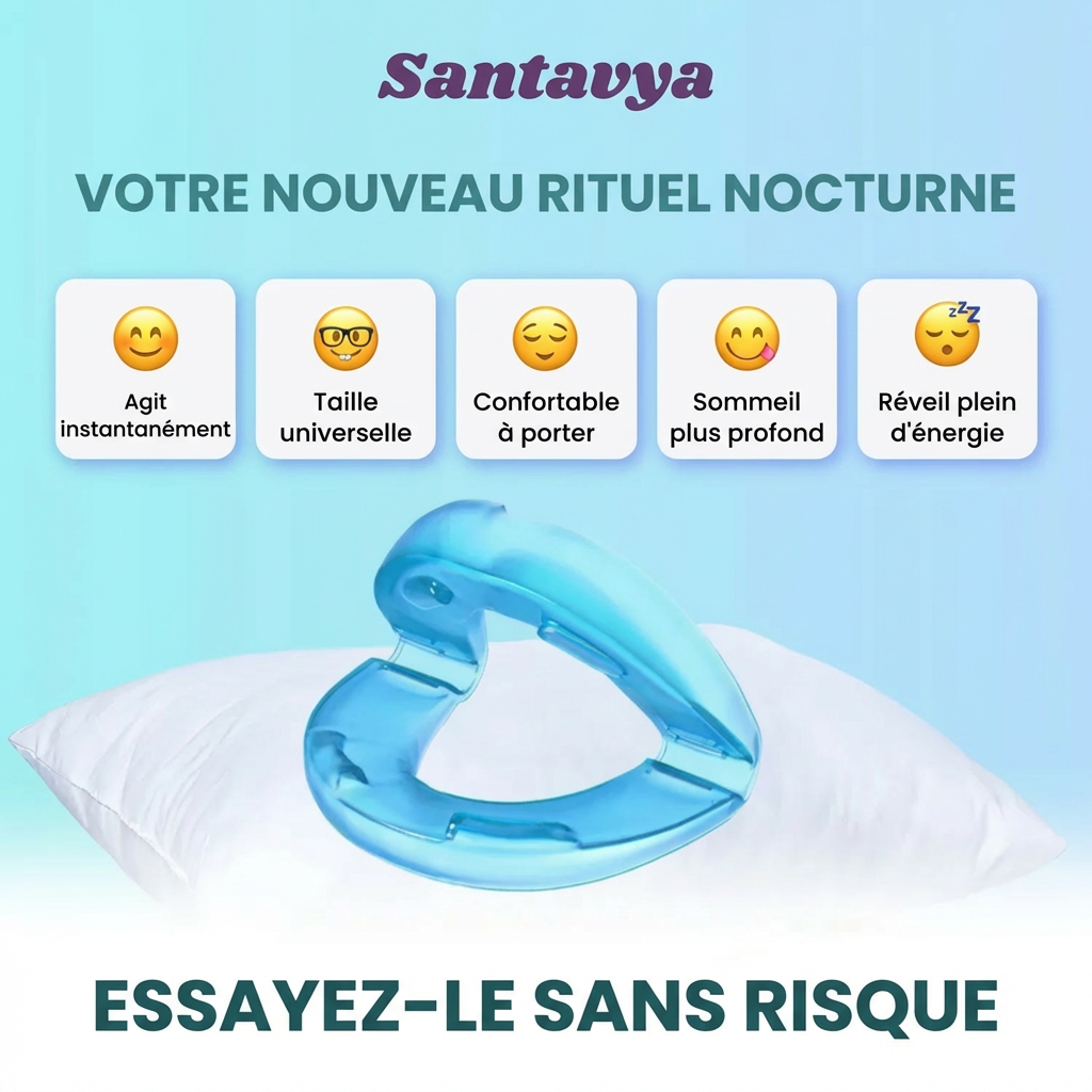 Santavya™ est conçu par des dentistes, approuvé par des médecins et certifié par la FDA. Il élimine les ronflements instantanément, en toute sécurité, simplement et naturellement, pour un sommeil plus profond, plus d'énergie et des relations plus épanouissantes.